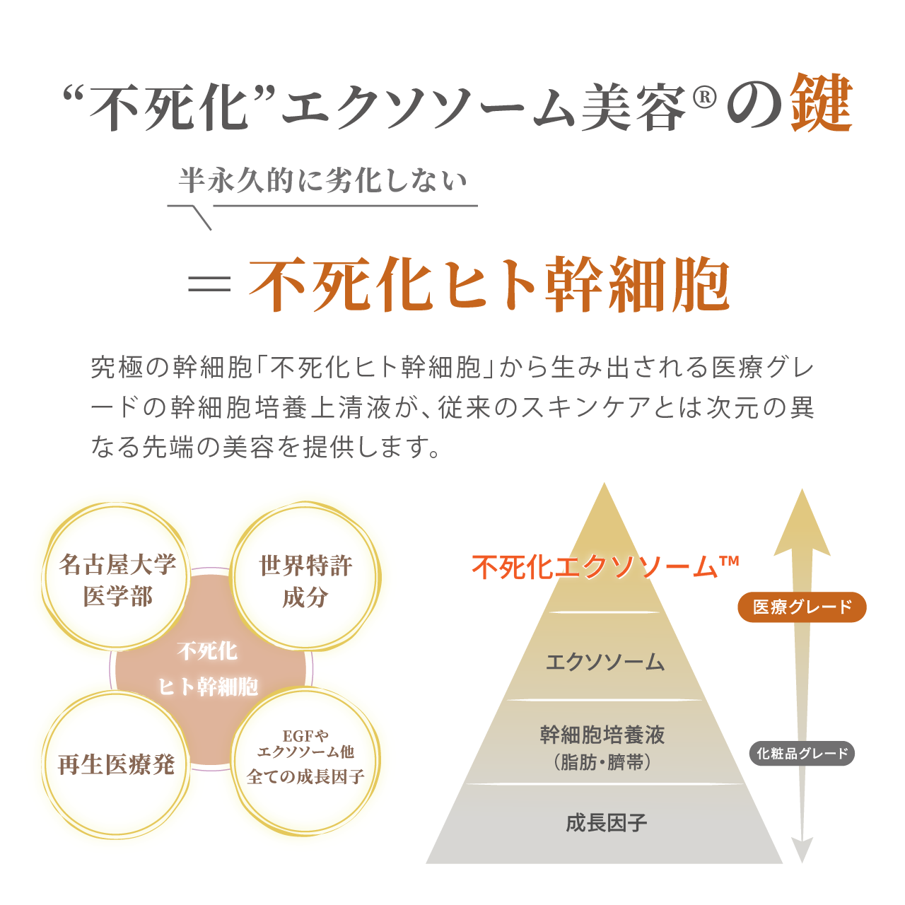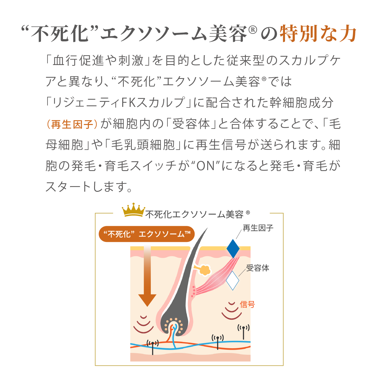 “不死化”技術によって大幅に機能を高めたエクソソームや成長因子が、頭皮本来の力を呼び覚まします。