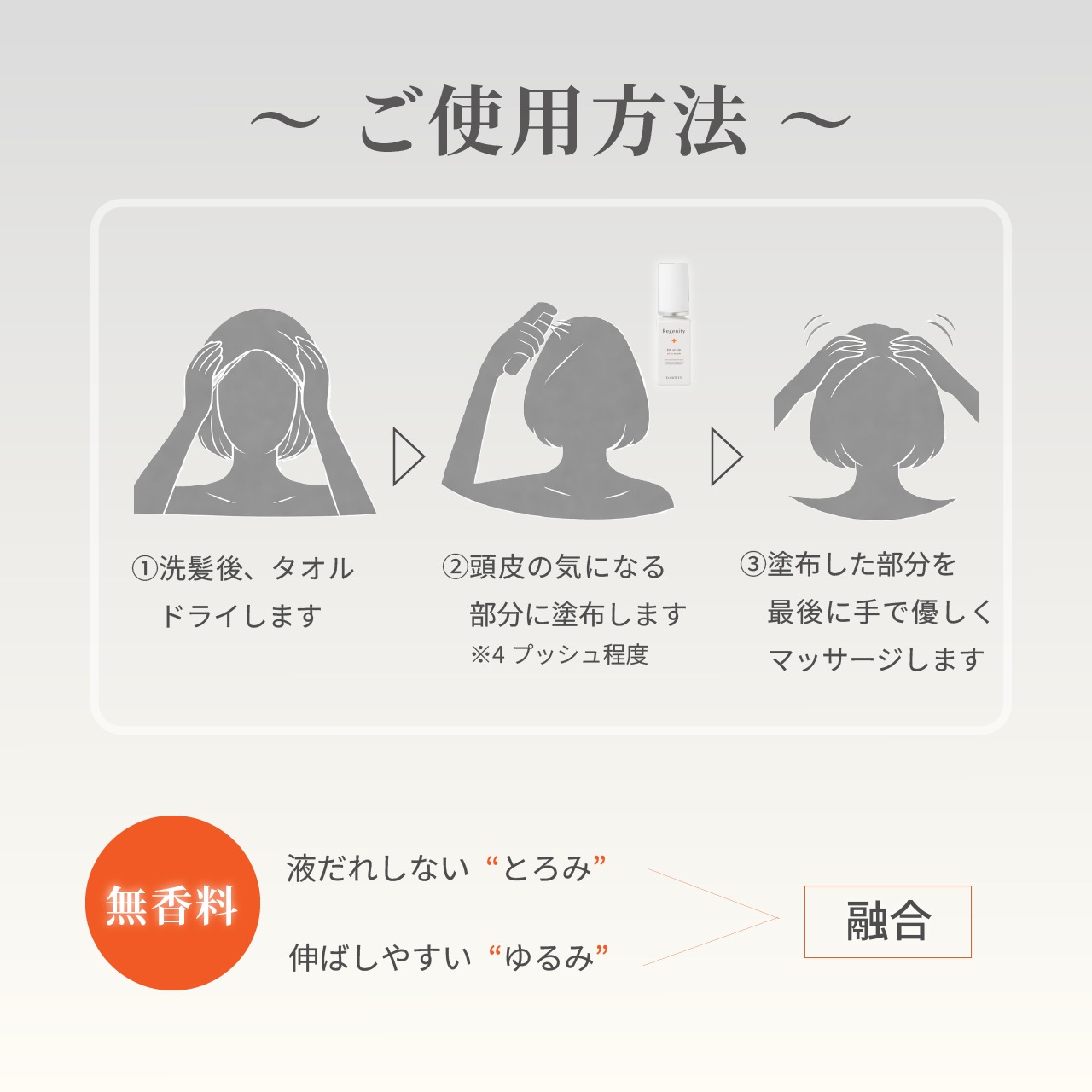 洗髪後、タオルドライした頭皮に適量(3~4プッシュ)を塗布。